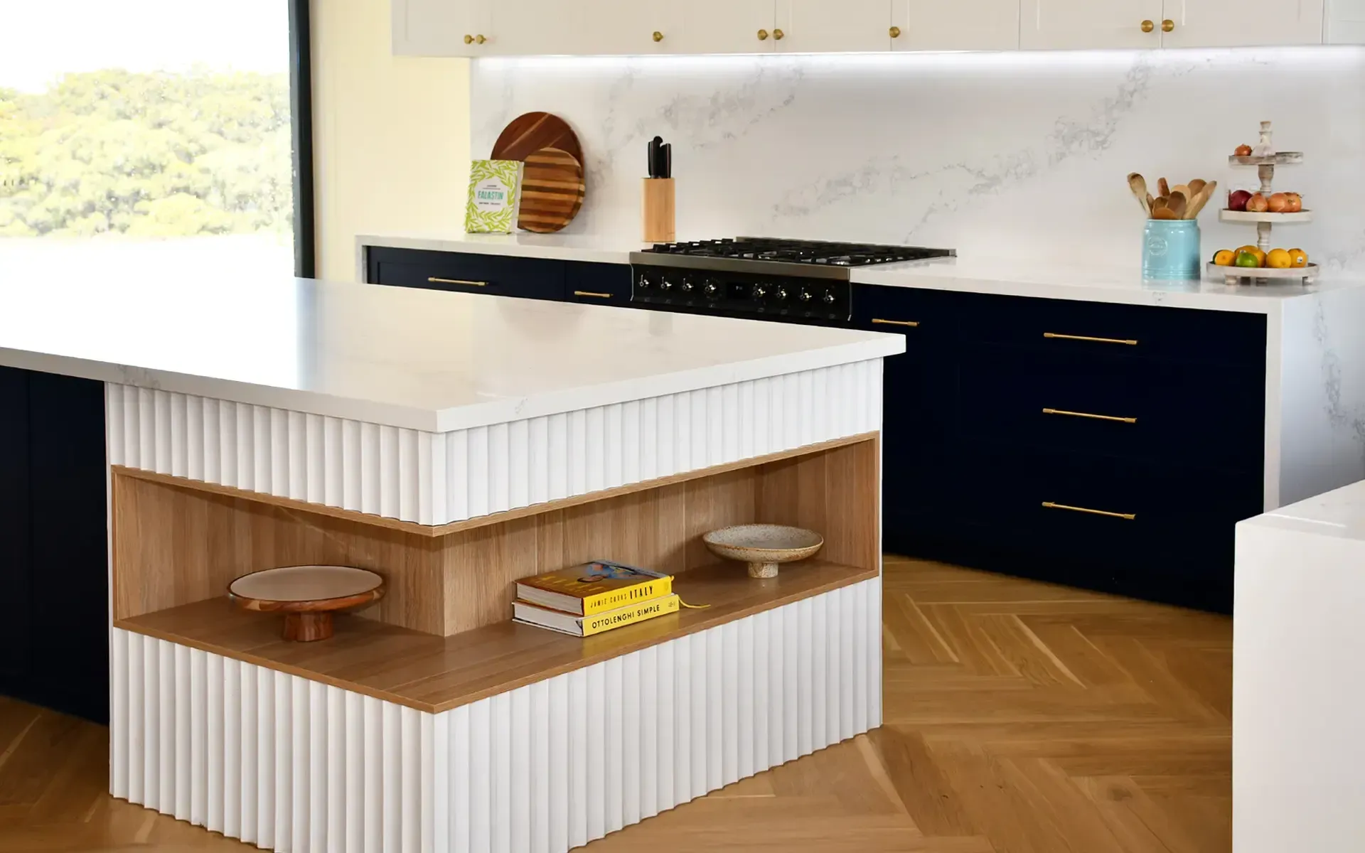 One example is the cutout shelf beneath the island bench. Creating this feature required internal steel reinforcing above and below the shelf to keep the structure solid while maintaining a clean finish. Another challenge was the angled walls in the large butler’s pantry. We custom built cupboards that open and operate smoothly on both the acute and obtuse angled sides.